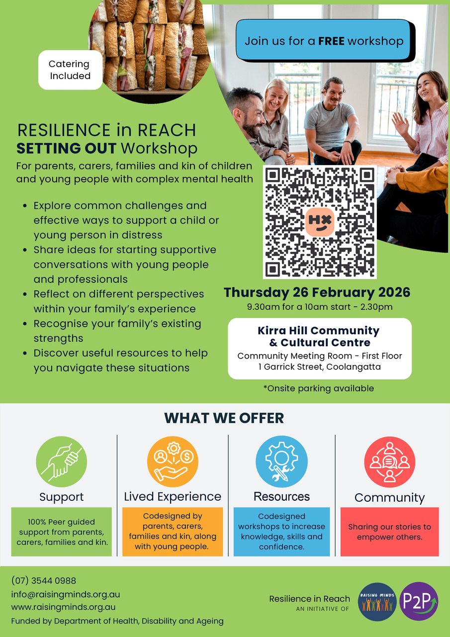 Resilience in Reach is a 100% peer-led initiative providing tools, resources, workshops, and community support for families, parents, carers, and kin of children and young people with complex mental health conditions and/or complex psychosocial disabilities