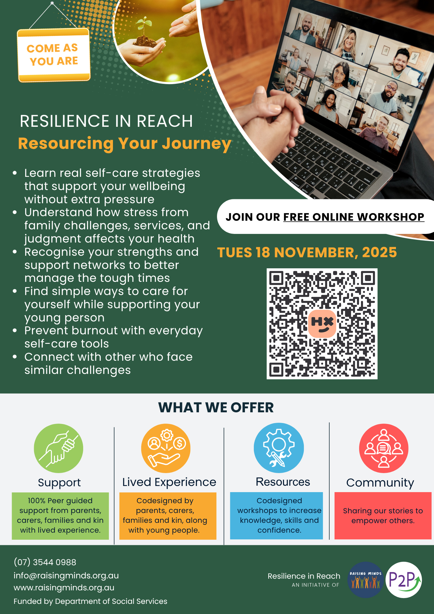 Resilience in Reach is a 100% peer-led initiative providing tools, resources, workshops, and community support for parents, carers, families and kin of children and young people with complex mental health conditions and/or complex psychosocial disabilities.